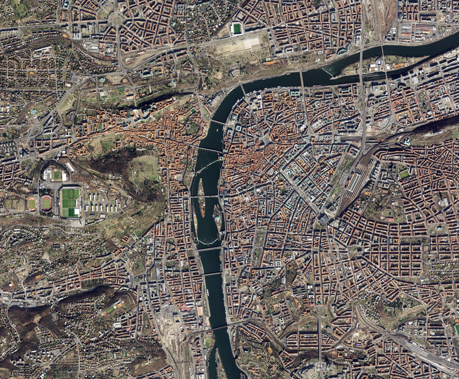 Praga ospita anche numerosi parchi, giardini e strutture ricreative, tra cui il vasto complesso sportivo Strahov visibile a ovest dell’isola di Kampa.